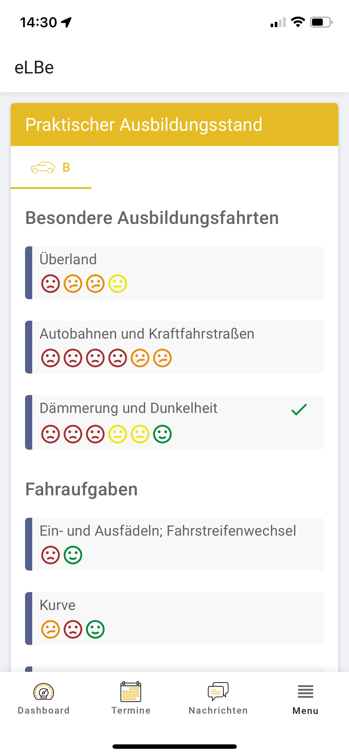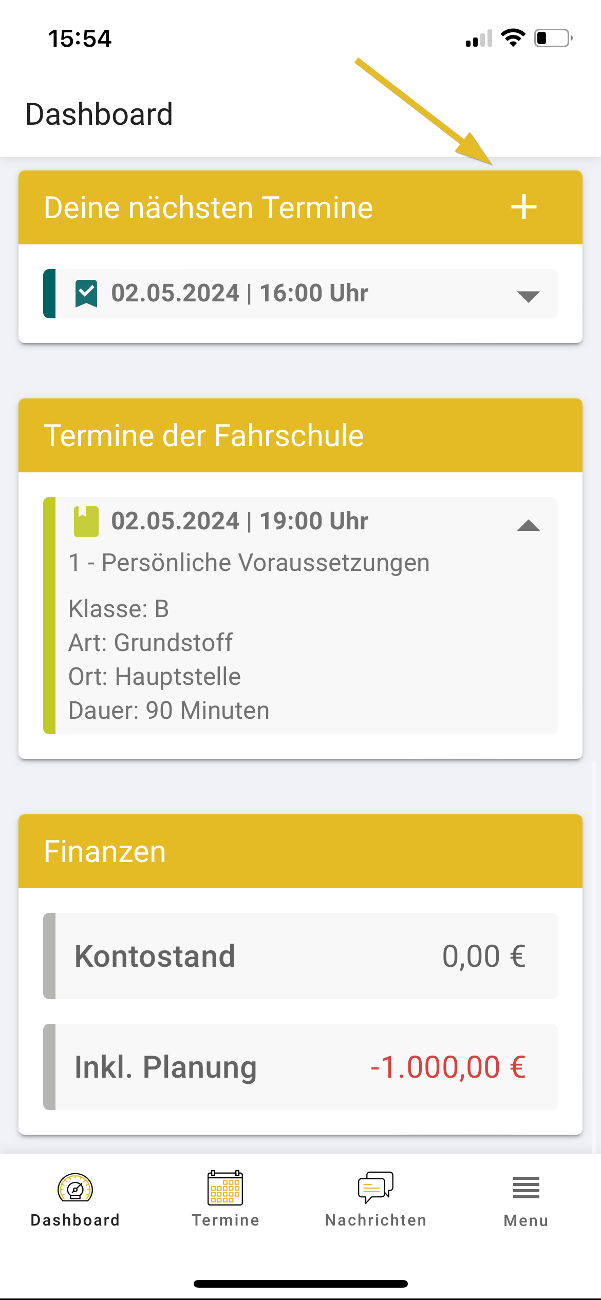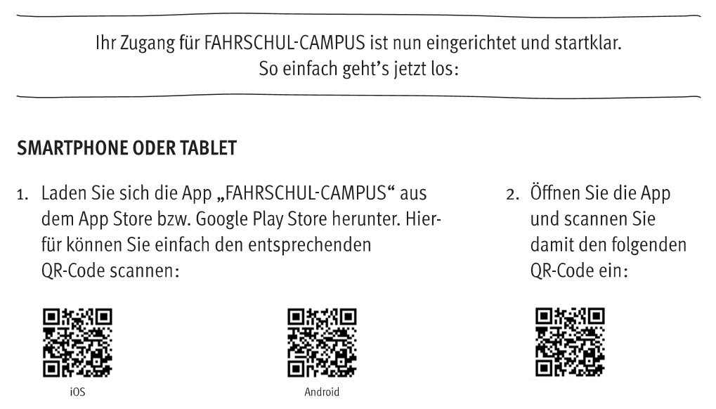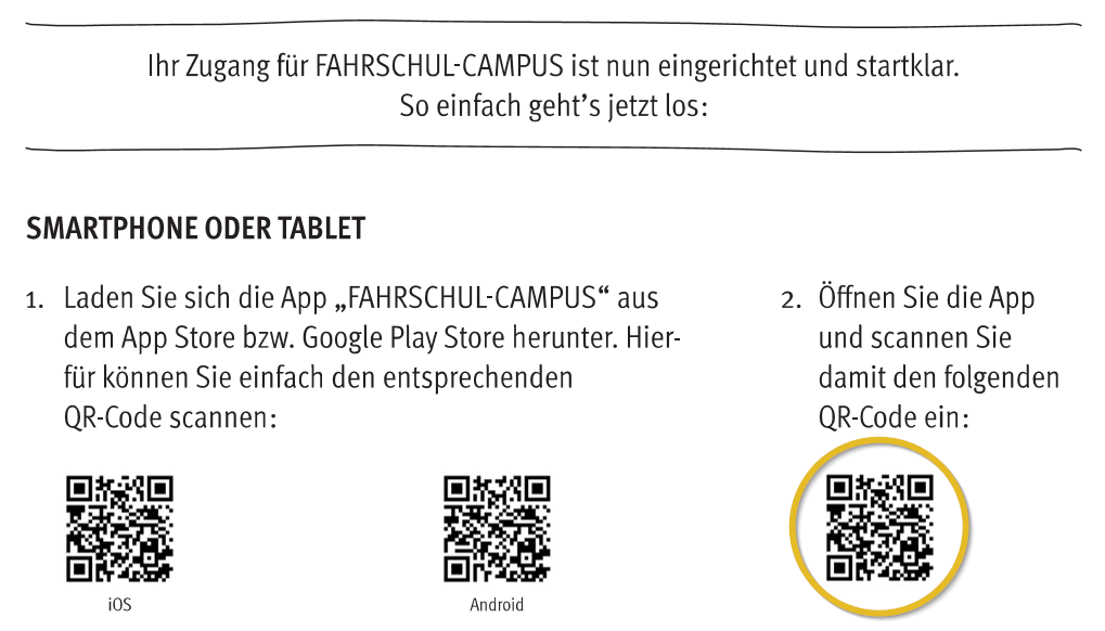 Du hast von Deiner Fahrschule ein Zugangsdatenblatt erhalten, auf dem sich mehrere QR-Codes befinden. Zwei QR-Codes zeigen Dir den Weg zur App, ein weiterer beinhaltet Deine Zugangsdaten. Wenn Du die App heruntergeladen und installiert hast, tippe auf die Kachel COCKPIT. Wähle dann am unteren Bildschirmrand QR-Code aus. Die App wird nun zunächst die Berechtigungen für die Kamera abfragen, bestätige diese und scanne dann den QR-Code ein.